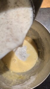 • Verser le lait bouillant, mélanger puis retransvaser la crème dans la casserole pour la cuire jusqu'à épaississement. Laisser refroidir.