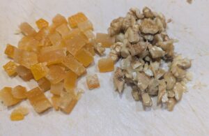 • Couper en petits morceaux l'écorce d'orange confite et les 10 gr de cerneaux de noix (pas trop petits)