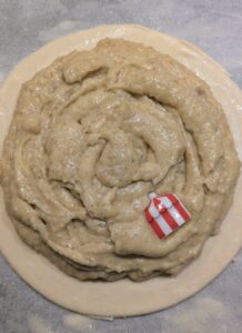 • Placer la fève (éviter le centre) ainsi que les petits morceaux d'écorce d'orange et de noix