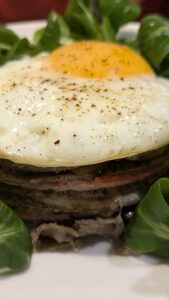 • Déposer un oeuf au plat sur le 1000 feuilles de galette (ici réaliser avec un cercle)