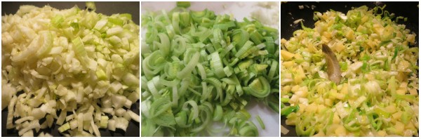 - Détailler en brunoise (petits cubes) le bulbe de fenouil et finement le poireau. Emincer les gousses d'ail après avoir enlevé le germe. Couper en cubes (plus gros que le fenouil) les pommes de terre préalablement épluchées.